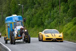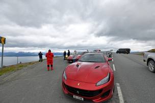 Endlich treffen wir in Olderdalen ein. Die Fähre sollte uns zur anderen Seite des Fjords bringen. So jedenfalls stand’s im Programm. Wir stellen uns am Pier bereit, doch von der Fähre ist weit und breit nichts zu sehen. „Cancelled“ leuchtet auf der grossen Anzeigetafel. Was beim „gewöhnlichen“ Automobilisten für veritable Kraftausdrücke sorgt, zaubert dem Ferrarista ein genüssliches Lächeln auf’s Gesicht. Die zusätzliche Wegstrecke verschafft uns eine gute Stunde mehr Fahrzeit. Vorzeitiges Tanken ist angesagt. Und ein Traktor mit auffälliger Kühlerfigur überholt uns zum dritten Mal – eigentlich unerhört, nicht?